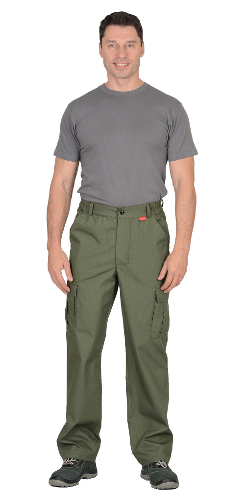 Брюки прямого силуэта; с застежкой гульфика на тесьму - «молния»; с притачным поясом, стянутым по бокам на резинку ткацкую, застегивающимся на пуговицу; на поясе 5 шлевок. Брюки с боковыми внутренними карманами, с двумя накладными полуобъемными карманами на задних половинках, и на боковых швах. тк."Рип-Стоп", ВО, 65% п/э., 35% х/б, 215 г/кв.м. ГОСТ 12.4.280-2014
