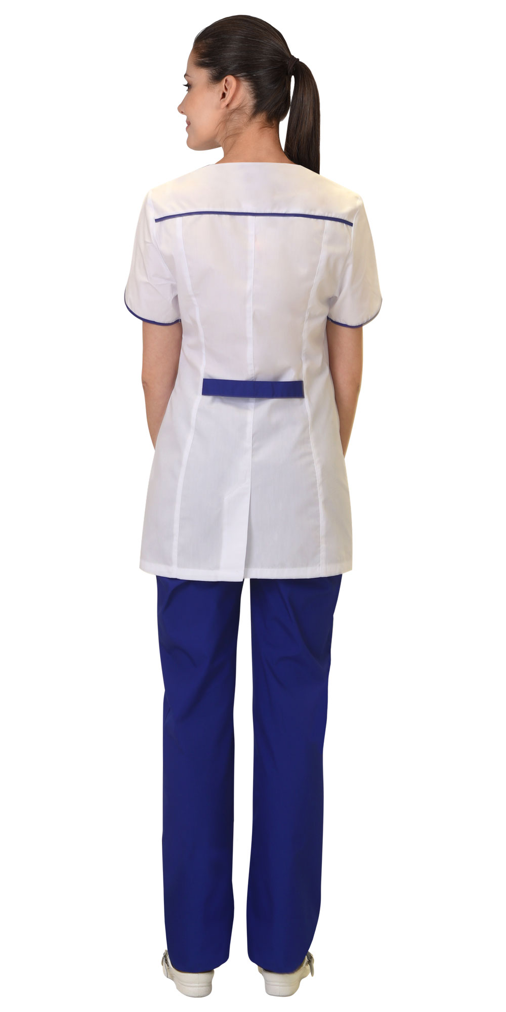 Блуза полуприлегающего силуэта, с центральной застёжкой на петли и пуговицы. Овальный вырез, верхний нагрудный карман и два нижних накладных кармана, втачные короткие рукава. Нижний срез кокеток, шов рукава и нижний срез рукава окантованы косой бейкой из ткани отделка. Брюки прямые на притачном поясе, частично стянутом на эластичную тесьму, спереди на поясе вставка.