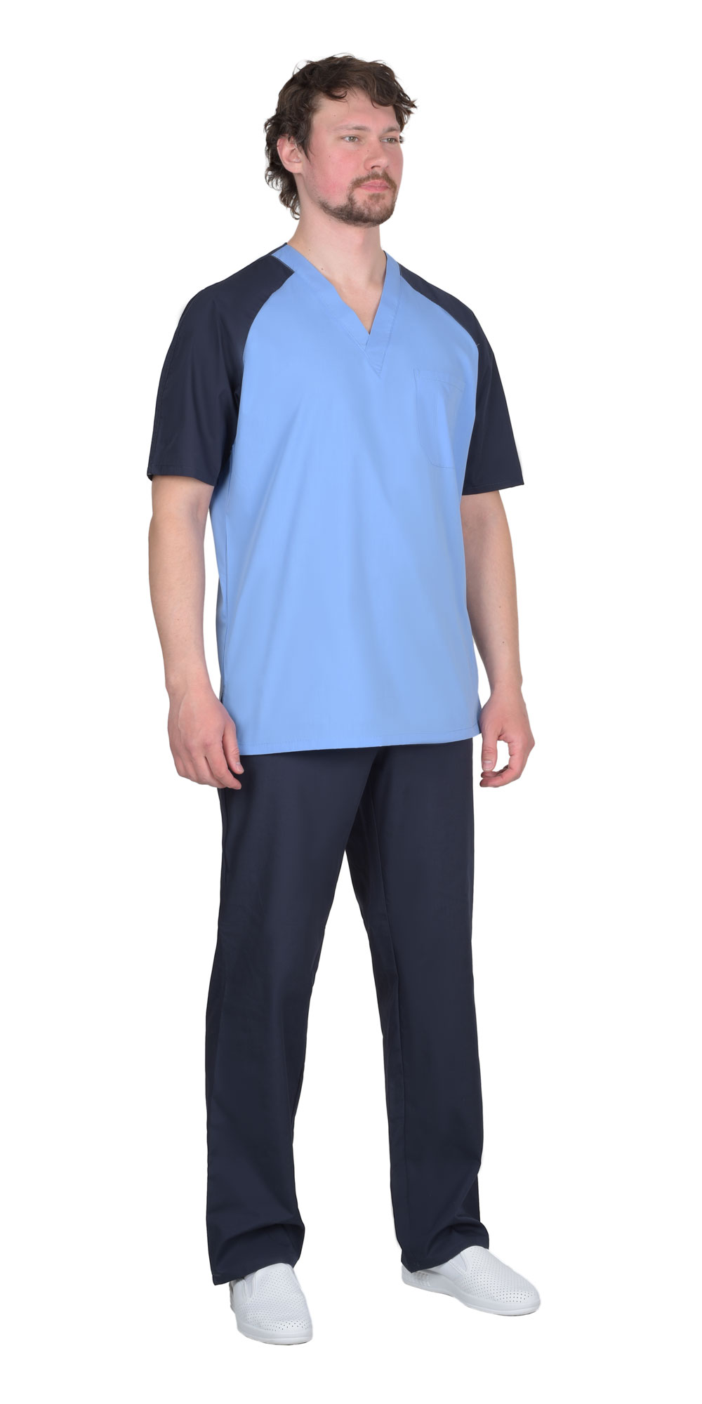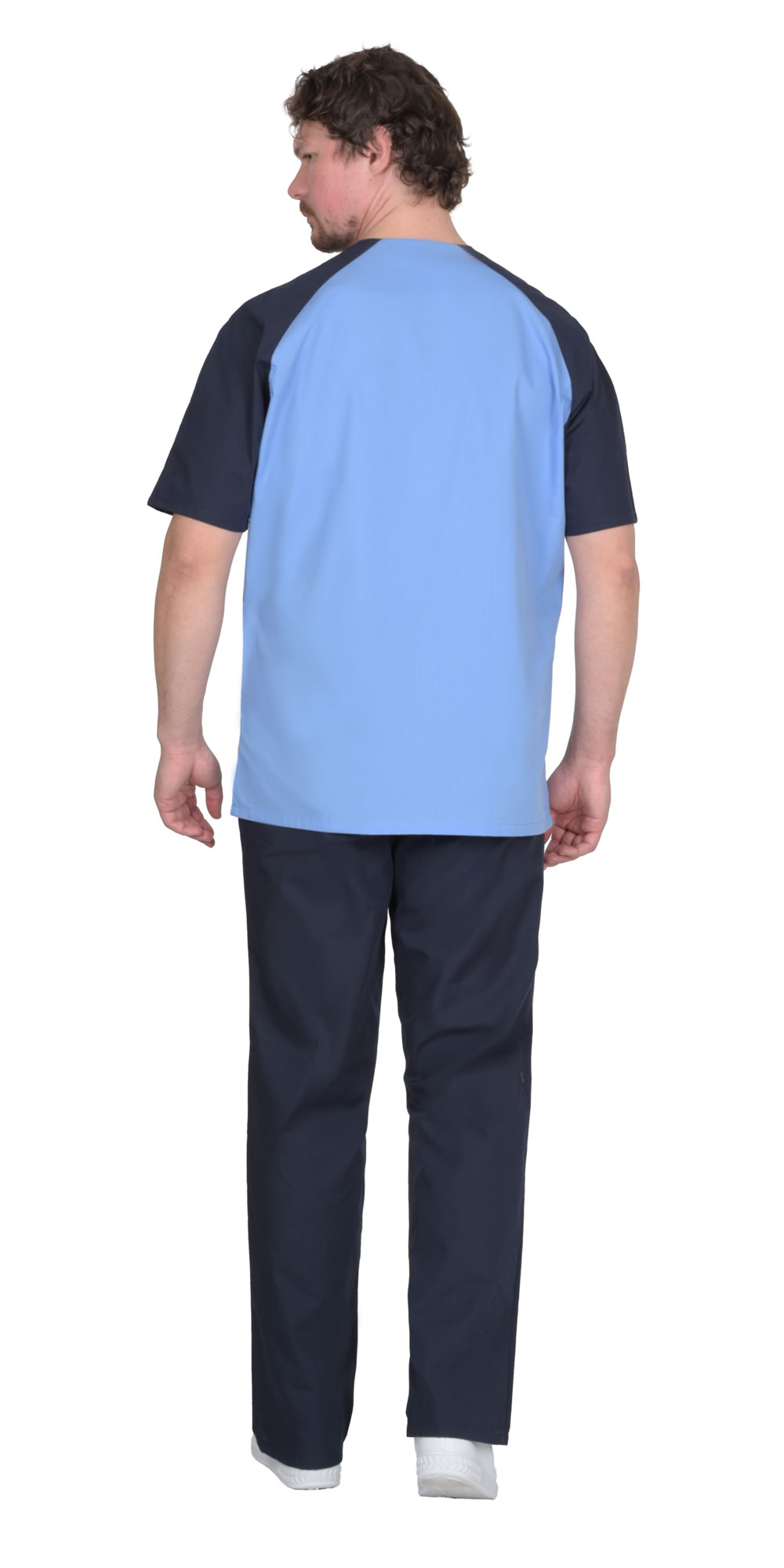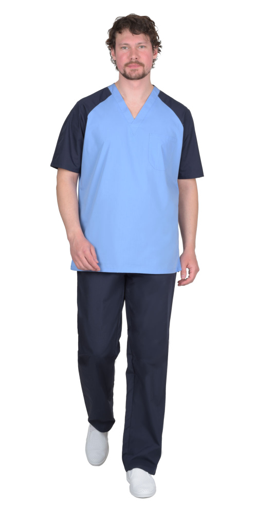 Костюм состоит из куртки и брюк. Куртка прямого покроя; с боковыми разрезами, с V-образным вырезом горловины и верхним левым нагрудным накладным карманом с делением для ручки. Рукава реглан, короткие. Брюки прямого покроя с внутренними боковыми карманами, пояс притачной, частично стянут на эластичную тесьму. Костюм можно дополнительно укомплектовать колпаком.