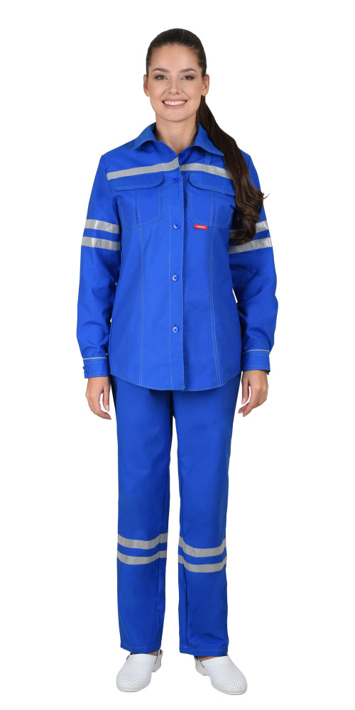 Костюм состоит из куртки и брюк. Куртка прямого силуэта с центральной застёжкой на пуговицы. Карманы с клапанами. Брюки с застёжкой гульфика на "молнию". В костюме предусмотрены светоотражающие полосы 25мм для обозначения сигнальной видимости.