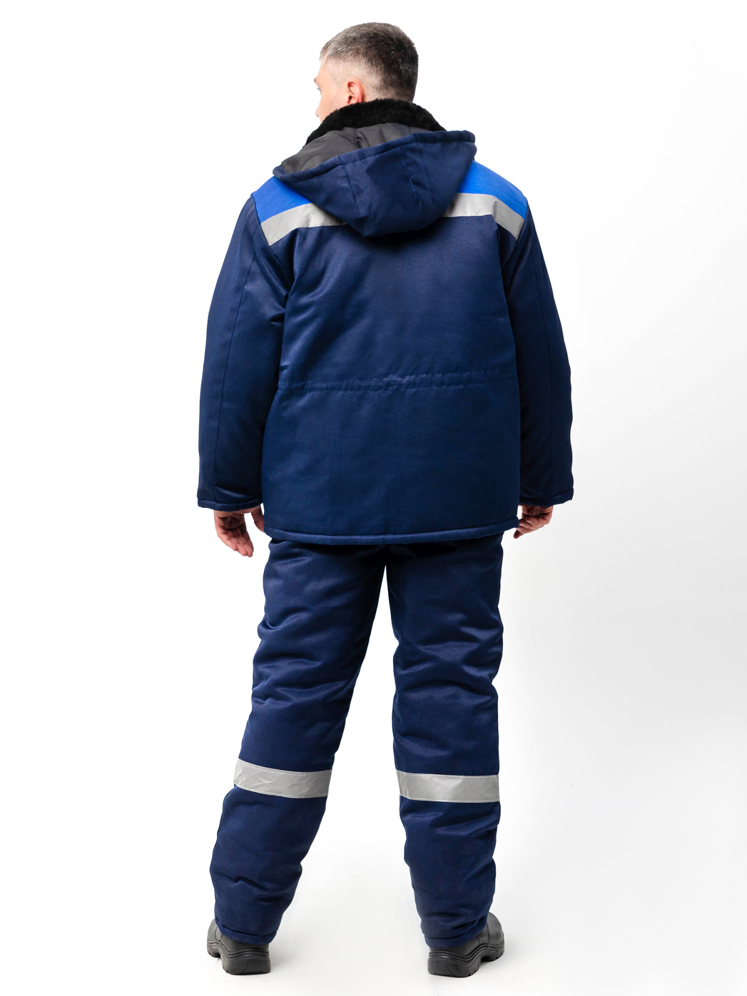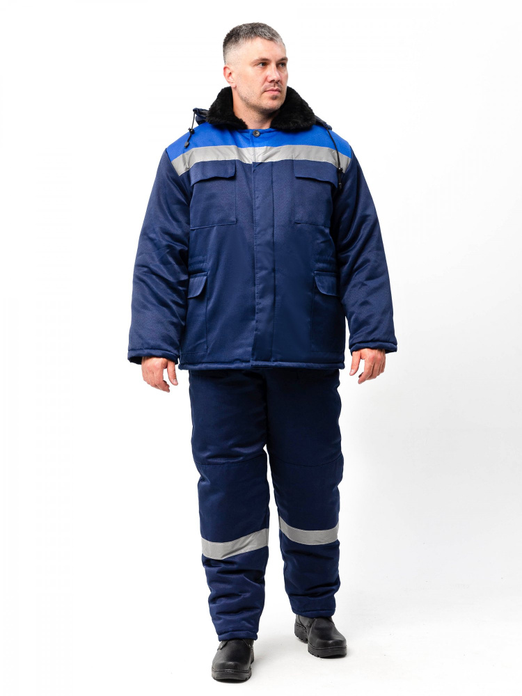 Костюм состоит из куртки и брюк. Куртка прямого силуэта с кокеткой из контрастной отделочной ткани со светоотражающей полосой 50мм. Центральная супатная застежка на петли и пуговицы. Имеется регулируемая кулиска по линии талии, удобные накладные боковые карманы и нагрудные карманы. Отстегивающийся капюшон на пуговицах, меховой воротник. Брюки прямые, с накладными карманами, на притачной утеплённой подкладке, с застёжкой гульфика на молнию. Брюки с широким притачным поясом с застежкой на петли и пуговицы, с бретелями. Бретели съемные, пристегиваются к брюкам при помощи пуговиц и петель, регулируются защелками-фастексами.