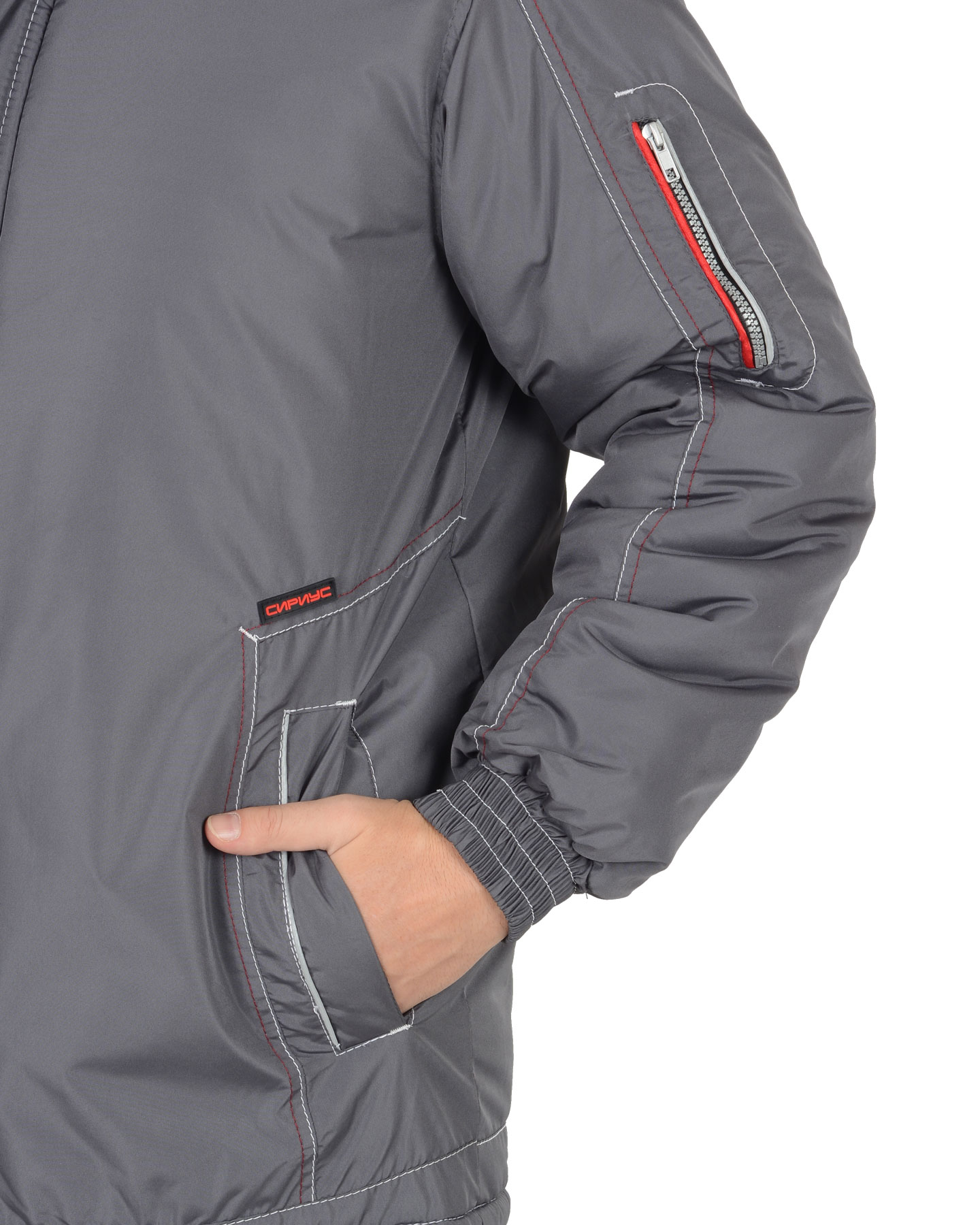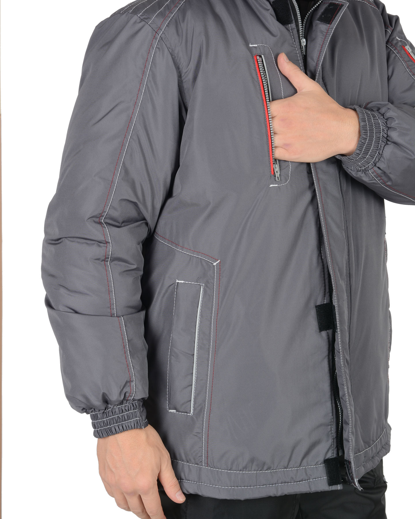 Куртка длинная, прямого силуэта, с притачной утепл.нной подкладкой и пристегивающимся капюшоном; воротником-стойкой; с кокеткой расстрочной нитками контрастного цвета; ветрозащитной планкой застегивающиеся на ленту «контакт»; подпланкой; с центральной заст.жкой на тесьму - «молния»; с верхним прорезными карманом с правой стороны на тесьму – «молния»; с нижними прорезными карманами в листочку; рукава втачные с манжетами частично стянутыми на резинку, на левом рукаве выполнен карман на тесьму – «молния», с внутренним карманом на тесьму – «молния». В куртке вшивается бордовый и СВ кант