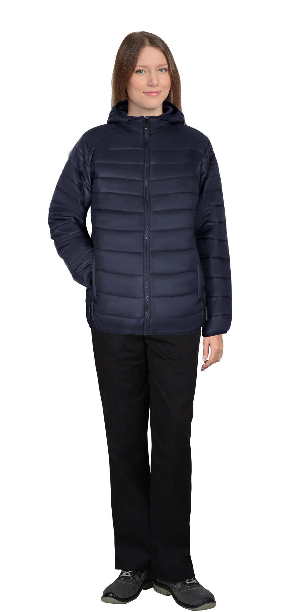 Куртка, утепленная из стёганного полотна, с центральной бортовой застёжкой молния, с втачным капюшоном, с общей кокеткой полочек и спинки, с втачными рукавами, с карманами на молнии в шве рельефа, с удлинённой фигурной линией низа на спинке. Низ куртки, низ рукавов и лицевой вырез капюшона окантованы эластичной тесьмой.