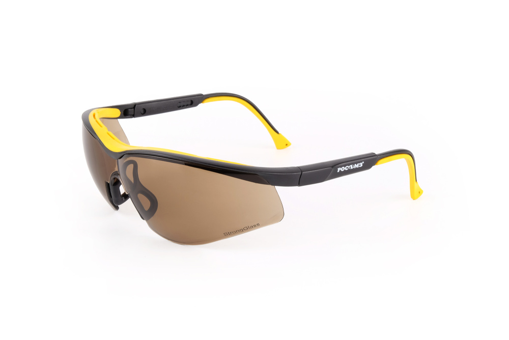 Очки открытые с мягкой вставкой в области лба, двухкомпонентными регулируемыми по длине и углу наклона заушниками с мягкими вставками и мягким носоупором из термо-холодостойкой резины.