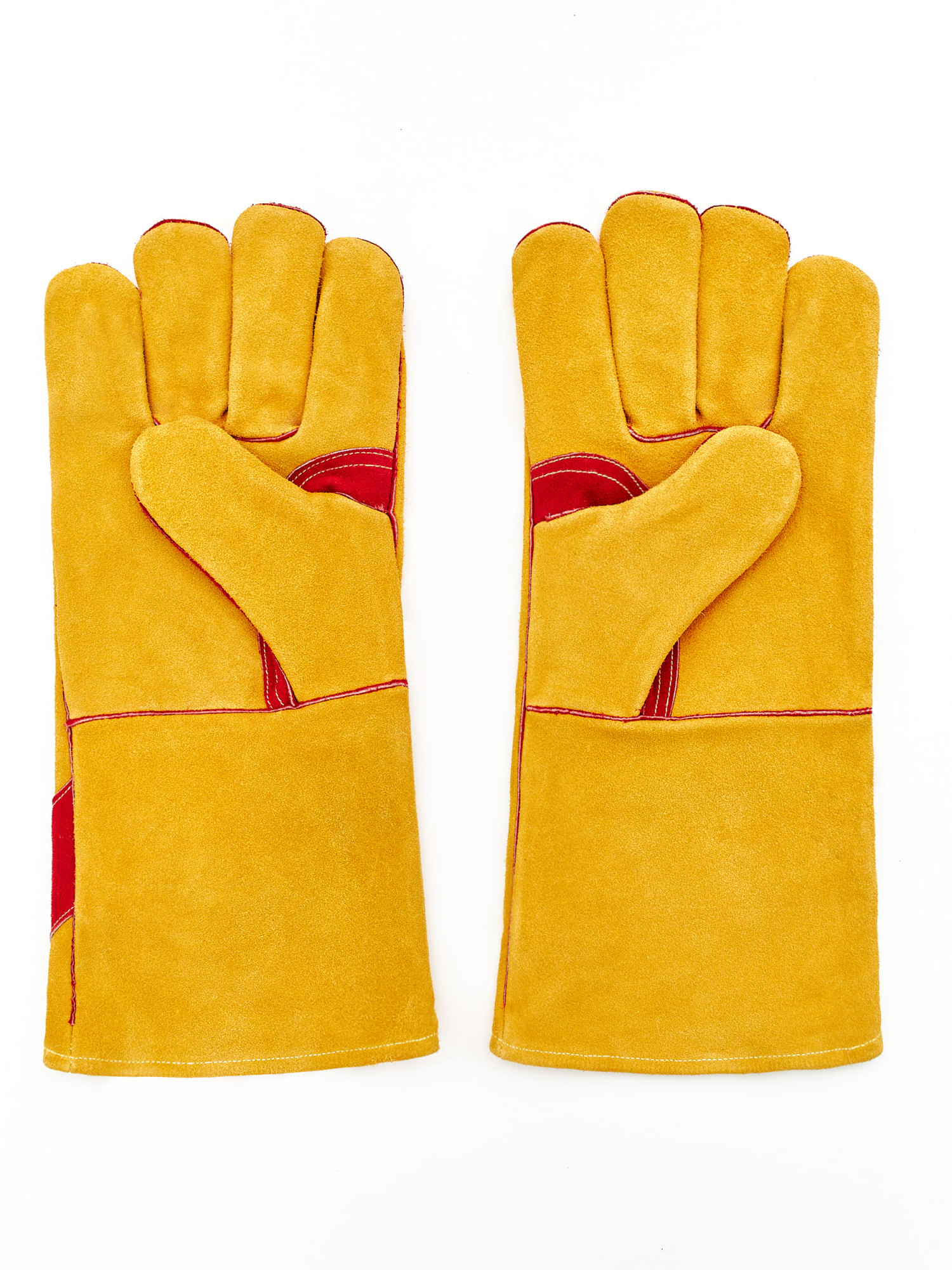 Особопрочные перчатки сварщика (краги) для защиты от механических воздействий, пониженных  и повышенных температур из цельного спилка, пятипалые, с подкладкой из специального комфортного искусственого меха желто-коричневого цвета. Длина: 10,5 размер - 350 мм, 12 размер - 410 мм. Спилок КРС специально отобранная спинная часть шкур прошедших предварительный отбор, спилок однородный, сорт AВ (1,3+/– 0,2 мм)). Швы — оригинальная нить Кевлар, усилены вставками из кожи, на ладонной части и большом пальце дополнительный слой из спилка красного цвета. Мех полностью сшит по периметру, для обеспечения наивысшего комфорта при использовании. Краги сварщика обеспечивают высокую механическую защиту, защиту от повышенных температур - открытого пламени, искр и брызг расплавленного металла, от пониженных температур.