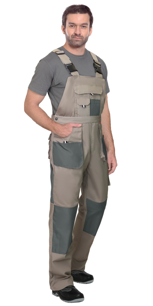 Полукомбинезон прямой с застёжкой в боковых швах на пуговицы и в среднем шве передних половинок на гульфик с молнией, с наколенниками, с бретелями. Полукомбинезон с накладными карманами спереди и сзади и на левом боковом шве, с объёмными наколенниками из плотной, непромокаемой ткани с нижним входом для амортизационного вкладыша. Бретели регулируются при помощи застежек-фастексов и резинки.